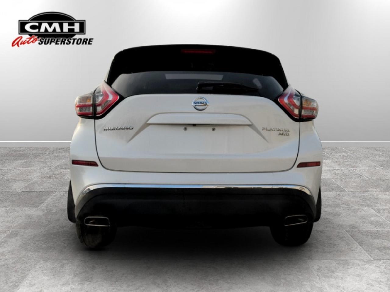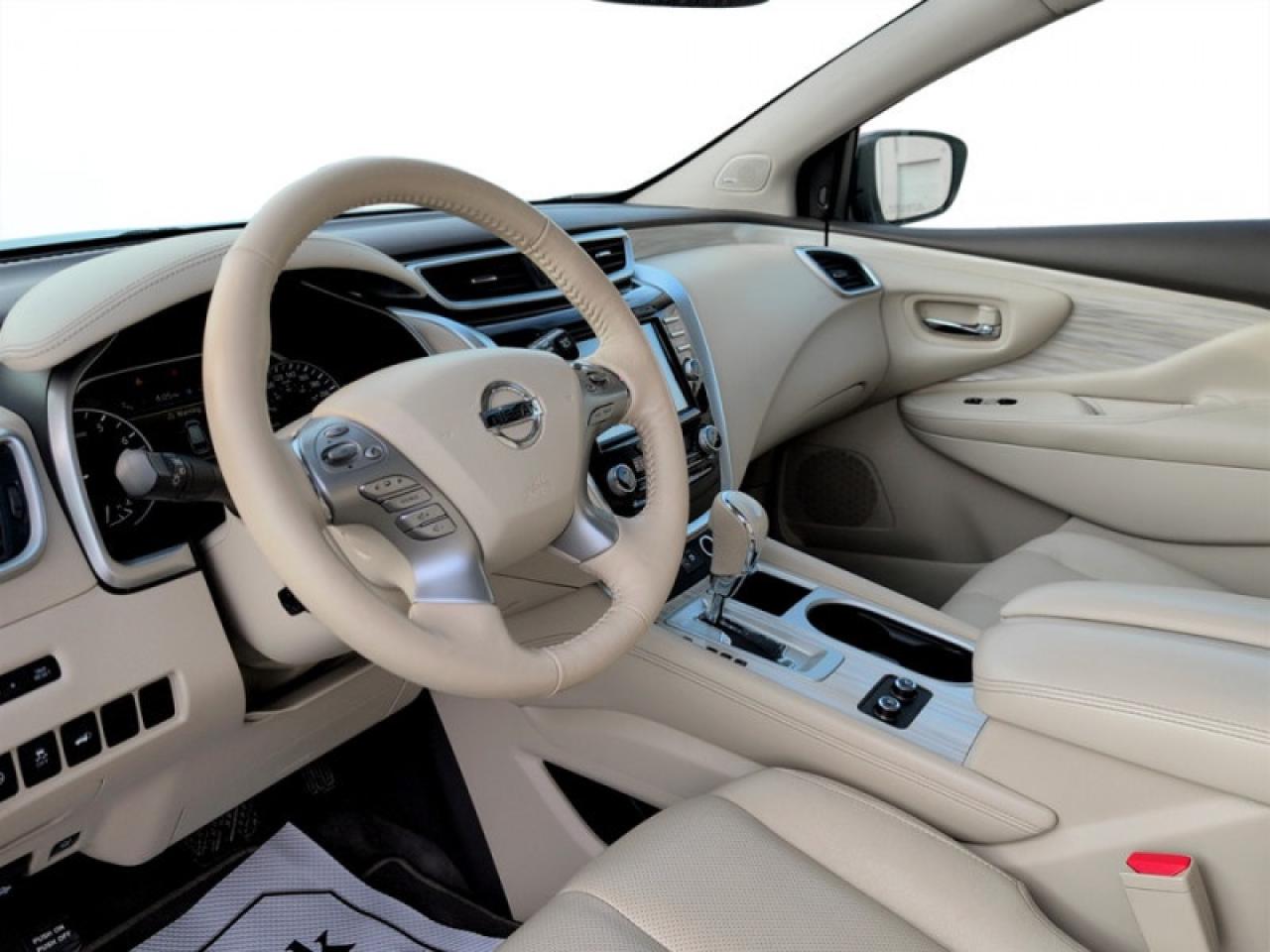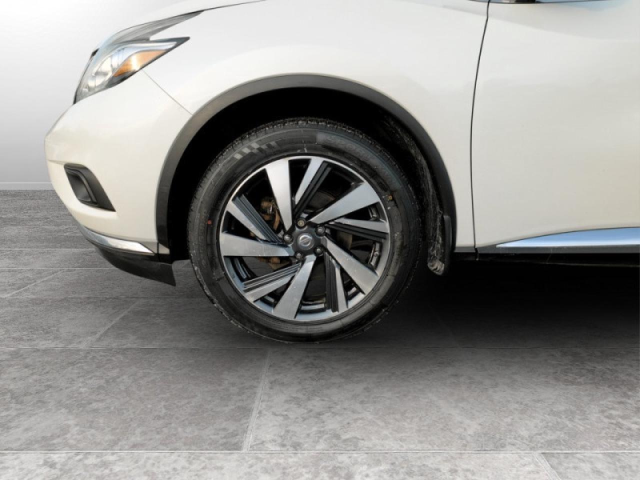 Our Murano's trim level is AWD Platinum. This Murano Platinum is a portrait of luxury. It comes with a power panoramic moonroof, remote start, navigation, Bluetooth, a power liftgate, a heated, leather-wrapped steering wheel, leather seats which are heated and cooled in front, heated back seats, an around view monitor, Bose 11-speaker premium audio, blind spot warning, moving object detection, intelligent cruise control, forward emergency braking, and more.