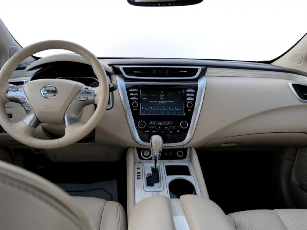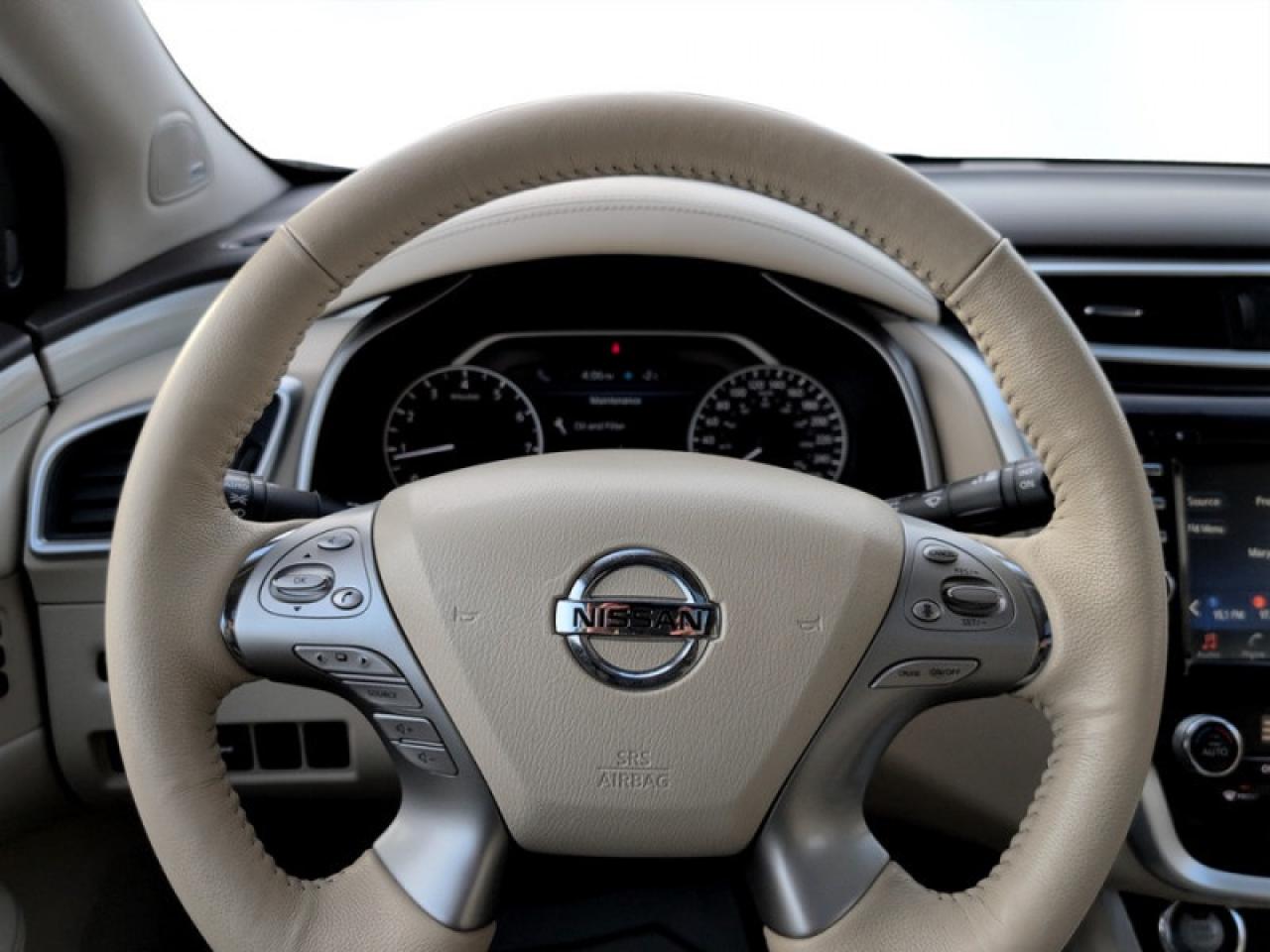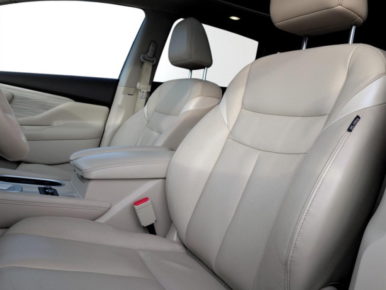 Our Murano's trim level is AWD Platinum. This Murano Platinum is a portrait of luxury. It comes with a power panoramic moonroof, remote start, navigation, Bluetooth, a power liftgate, a heated, leather-wrapped steering wheel, leather seats which are heated and cooled in front, heated back seats, an around view monitor, Bose 11-speaker premium audio, blind spot warning, moving object detection, intelligent cruise control, forward emergency braking, and more.