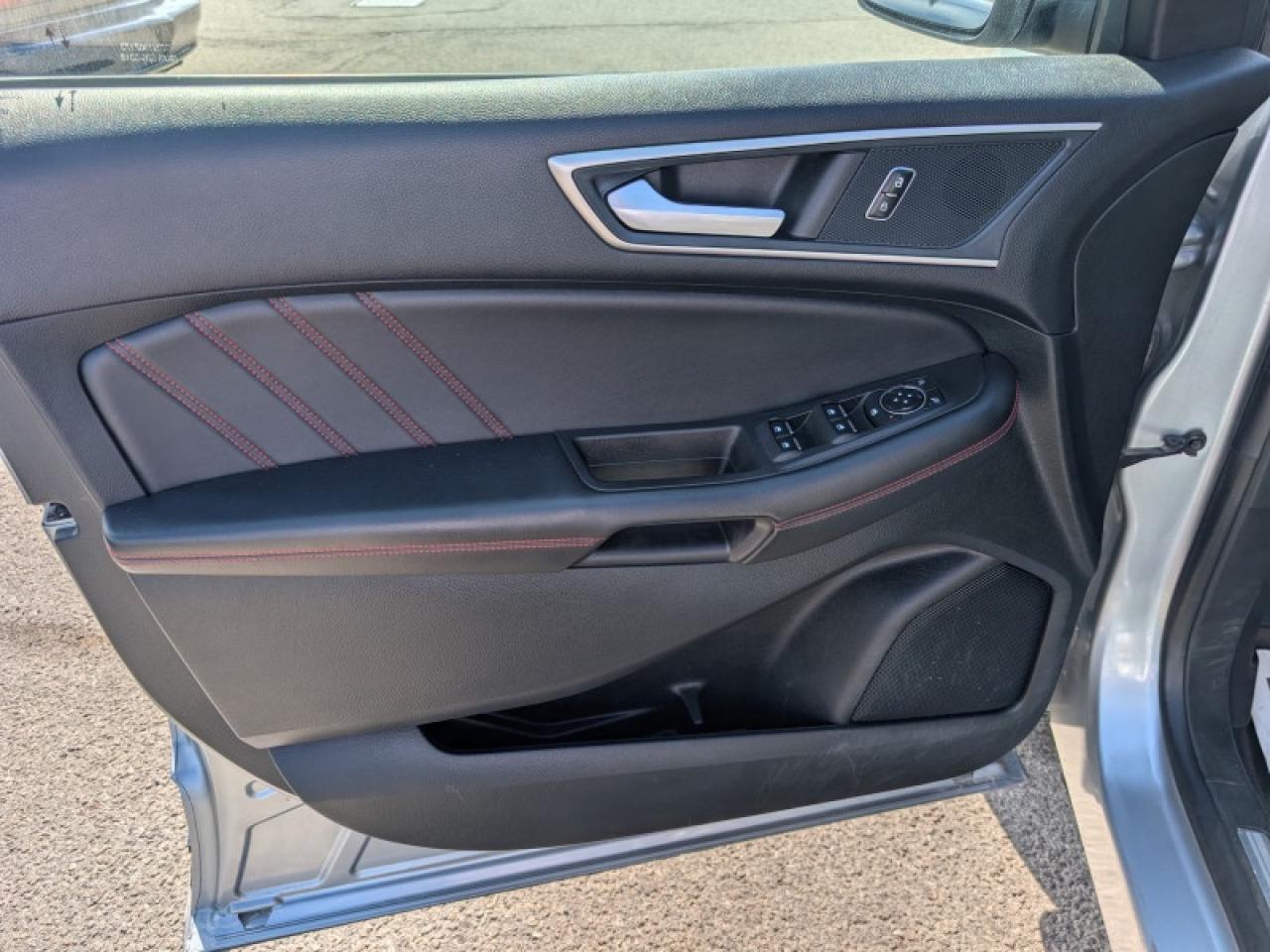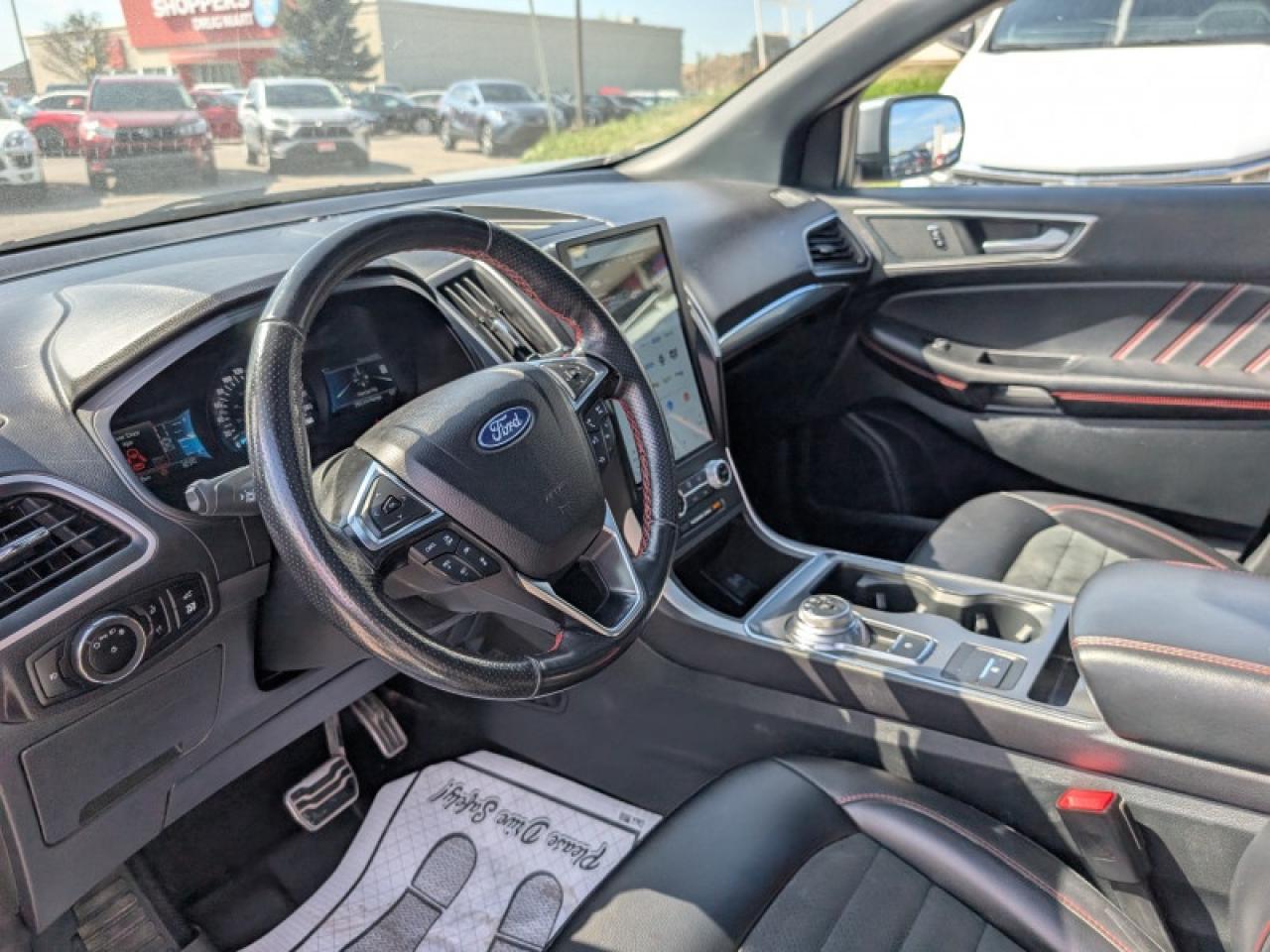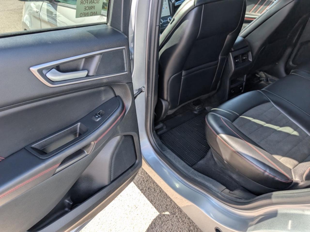 Our Edge's trim level is ST Line. Taking things to the edge with this ST Line trim, featuring unique gloss-black wheels, a blacked-out grille with trim-specific exterior styling, aggressive exhaust tips, front fog lamps, a numeric keypad for extra security, and supportive ActiveX heated front bucket seats, with power-adjustment and lumbar support. This trim also features a power liftgate for rear cargo access, a key fob with remote engine start and rear parking sensors, a 12-inch capacitive infotainment screen bundled with wireless Apple CarPlay and Android Auto, SiriusXM satellite radio, a 6-speaker audio setup, and 4G mobile hotspot internet connectivity. You and yours are assured of optimum road safety, with blind spot detection, rear cross traffic alert, pre-collision assist with automatic emergency braking, lane keeping assist, lane departure warning, forward collision alert, driver monitoring alert, and a rearview camera with an inbuilt washer. Also standard include proximity keyless entry, dual-zone climate control, 60-40 split front folding rear seats, LED headlights with automatic high beams, and even more.