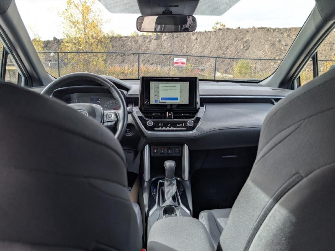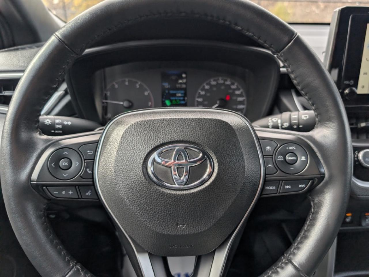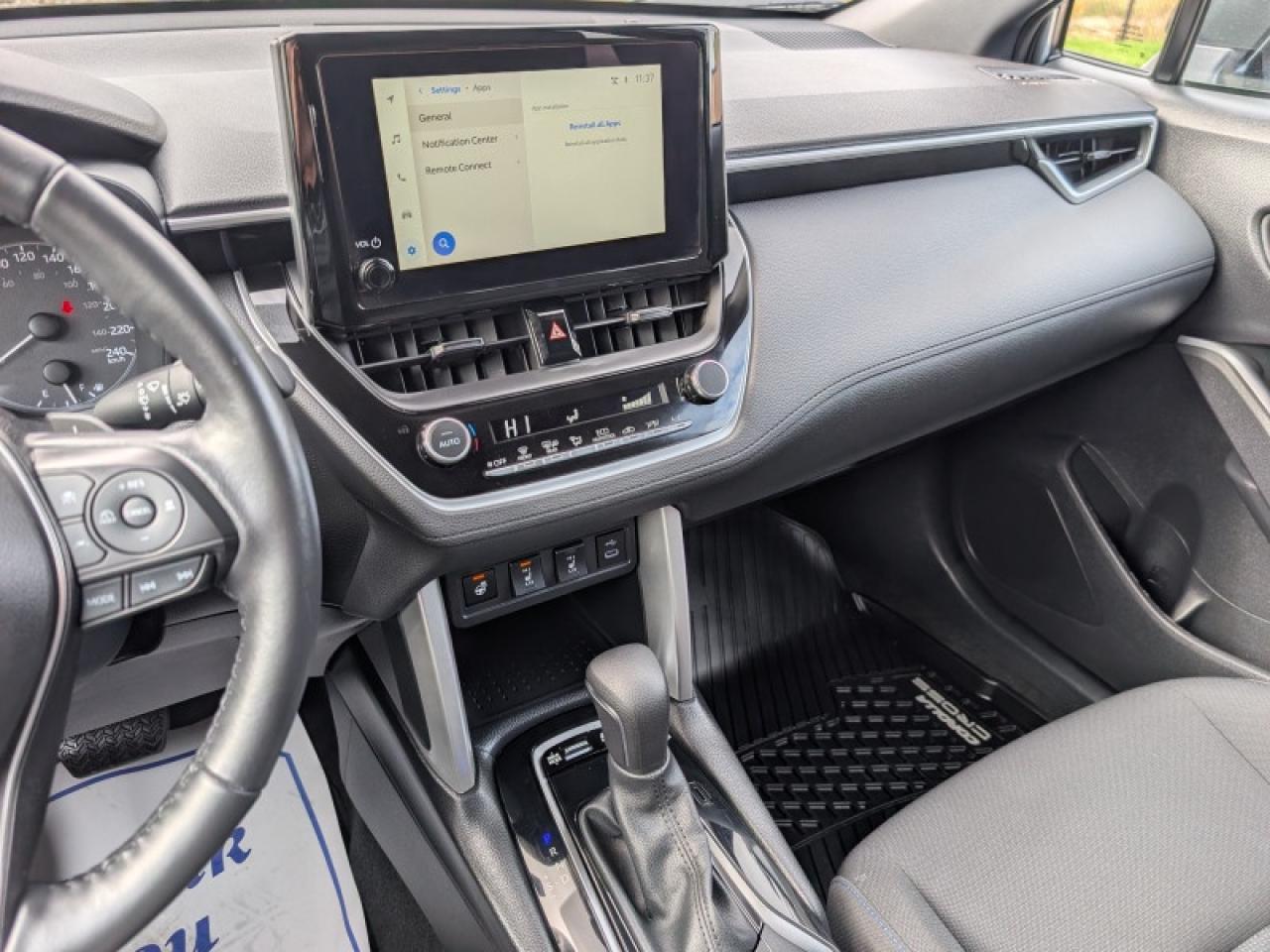 Our Corolla Cross's trim level is Hybrid SE AWD. This Corolla Cross SE Hybrid features a reliable and efficient hybrid powertrain for incredible fuel savings, and upgraded sport-tuned suspension for an exhilarating drive. Standard equipment include blind spot detection, rear cross traffic alert, a heated steering wheel and automatic air conditioning, along with heated front seats, 60/40 folding rear bench seats for more cargo space, adaptive cruise control, and an 8-inch Toyota multimedia infotainment system, with wireless Apple CarPlay and Android Auto. Safety features include pre-collision warning with intersection support, lane keeping assist with lane departure warning, forward collision mitigation, driver monitoring alert, and a rearview camera. Additional features include front and rear cupholders, remote keyless entry, LED headlights with automatic high beams, and even more!