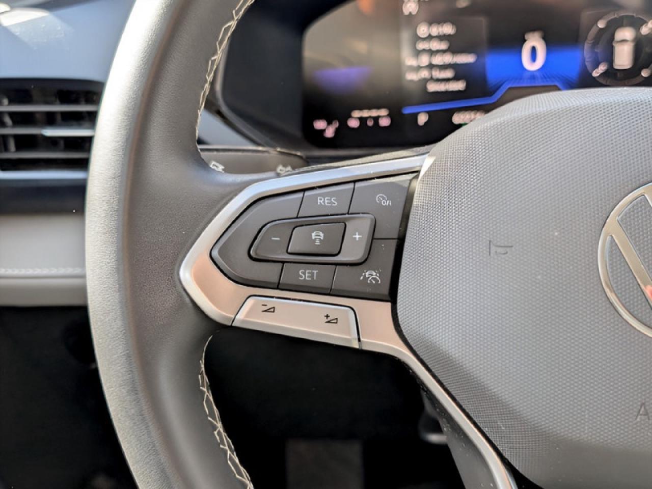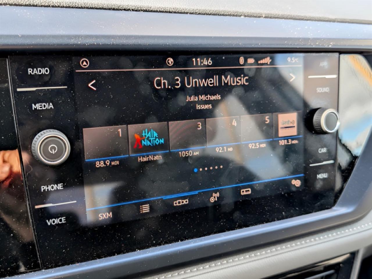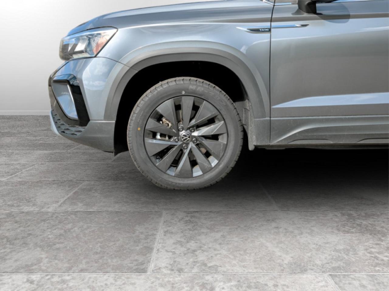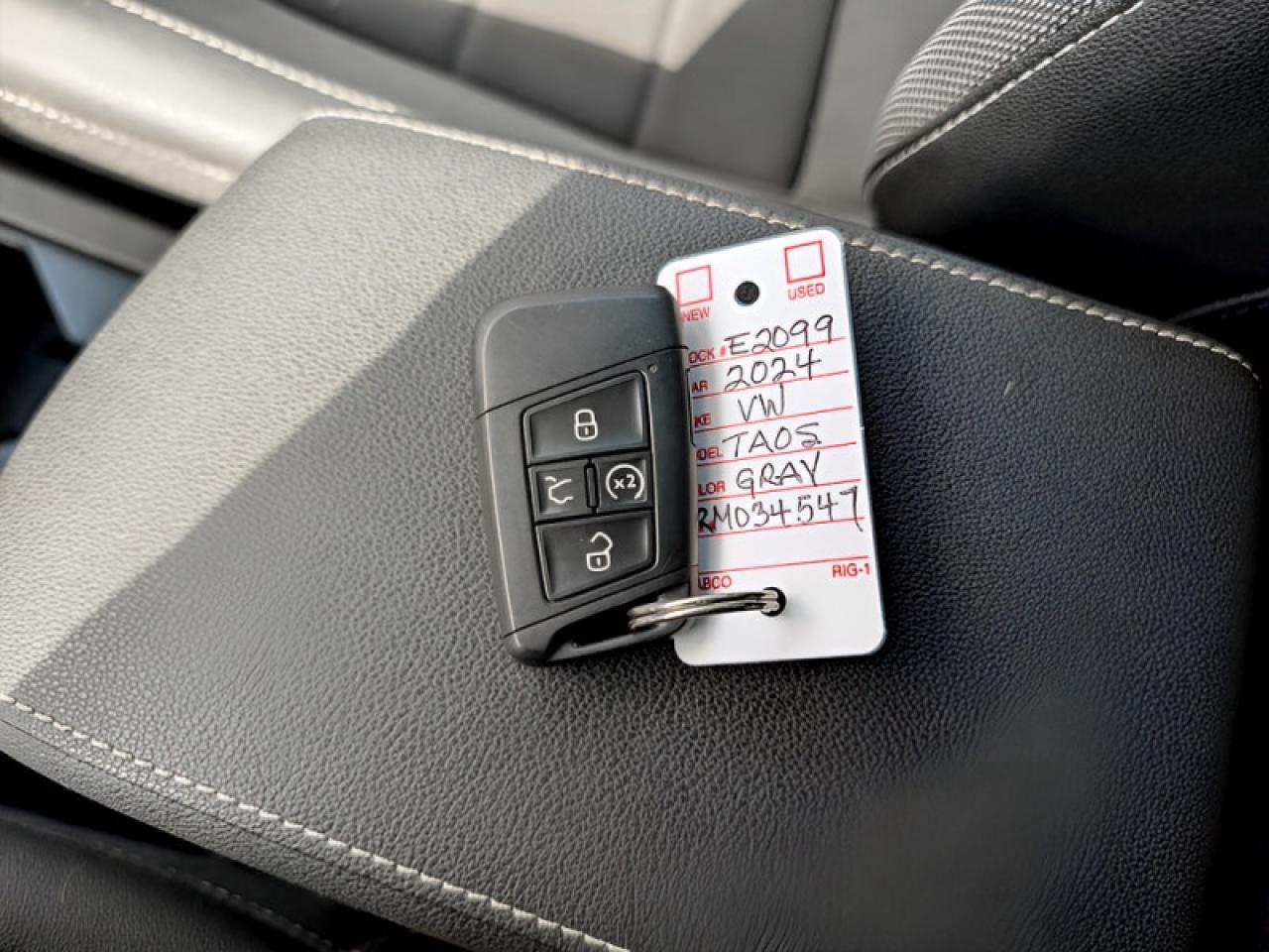 Our Taos's trim level is Comfortline. The Comfortline trim steps things up with adaptive cruise control, dual-zone climate control, remote engine start, lane keep assist with lane departure warning, and an upgraded 8-inch infotainment screen with VW Car-Net services. Additional features include heated front seats, a heated leatherette-wrapped steering wheel, remote keyless entry, and a wireless charging pad. Safety features include blind spot detection, front and rear collision mitigation, autonomous emergency braking, and a back-up camera.