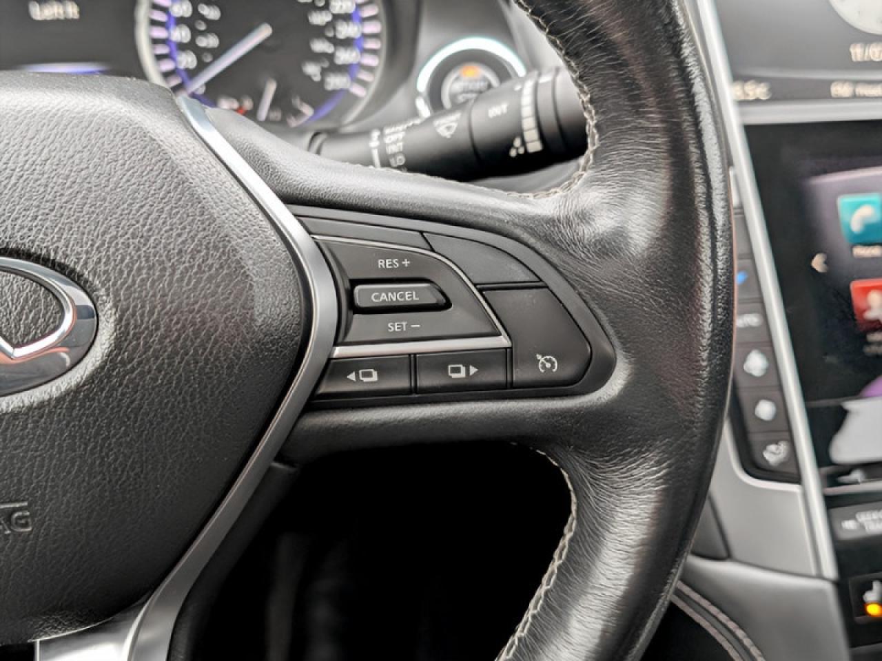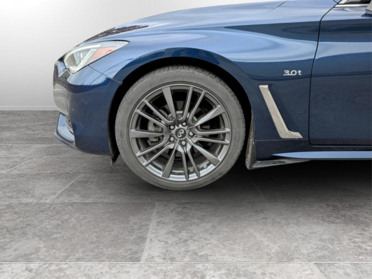 Our Q60's trim level is 3.0t. This exciting Q60 is generously appointed with luxurious features. It comes with leather seats which are heated in front, a heated steering wheel with audio and cruise control, a Bose 13-speaker premium sound system, navigation, Bluetooth, SiriusXM, a rearview camera, remote start, dual-zone automatic climate control, a power sunroof, automatic LED headlights, LED fog lights, and more.